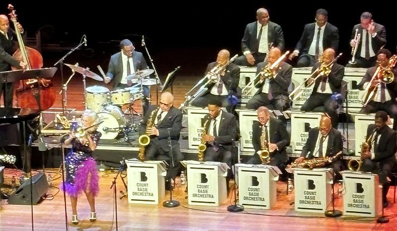 Efter familjen i första set gästade hon även här Basies, det enda storbandet som så att säga överlevt storbandens storhetstid i USA på 50-talet. Count Basie gick bort 1984. Nu leds bandet av William Scotty Barnhart i ”gammal stil” framför bandet men också som en femte trumpetare.