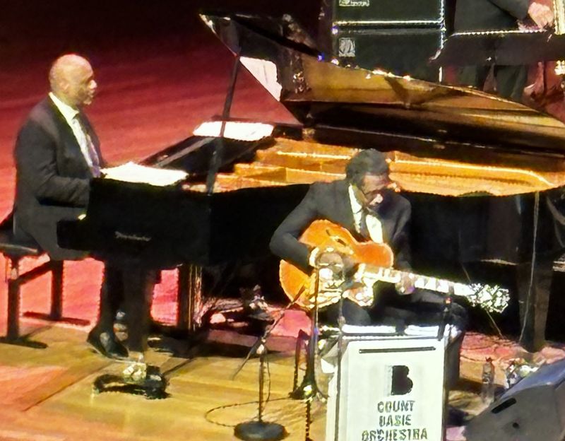 Självfallet – enligt mig – lät det förträffligt om de sedan många år samspelta och skickliga musikerna. Ett namn ska jag förstås nämna, Count Basies efterföljare vid pianot, Reggie Thomas. Det var knäpptyst i salen när han i en låt lekte med tangenterna i den yttersta diskanten. I övrigt gillade jag väl bäst gamla fina April In Paris – egentligen den enda jag riktigt kände igen… Lite trötta var man kanske efter idogt turnerande?